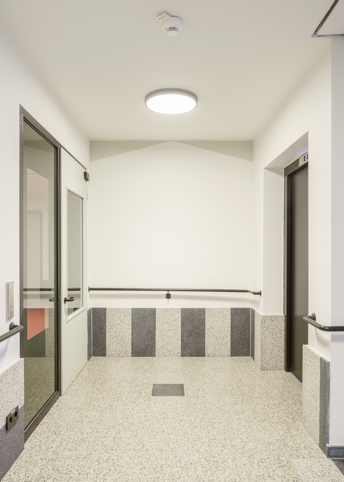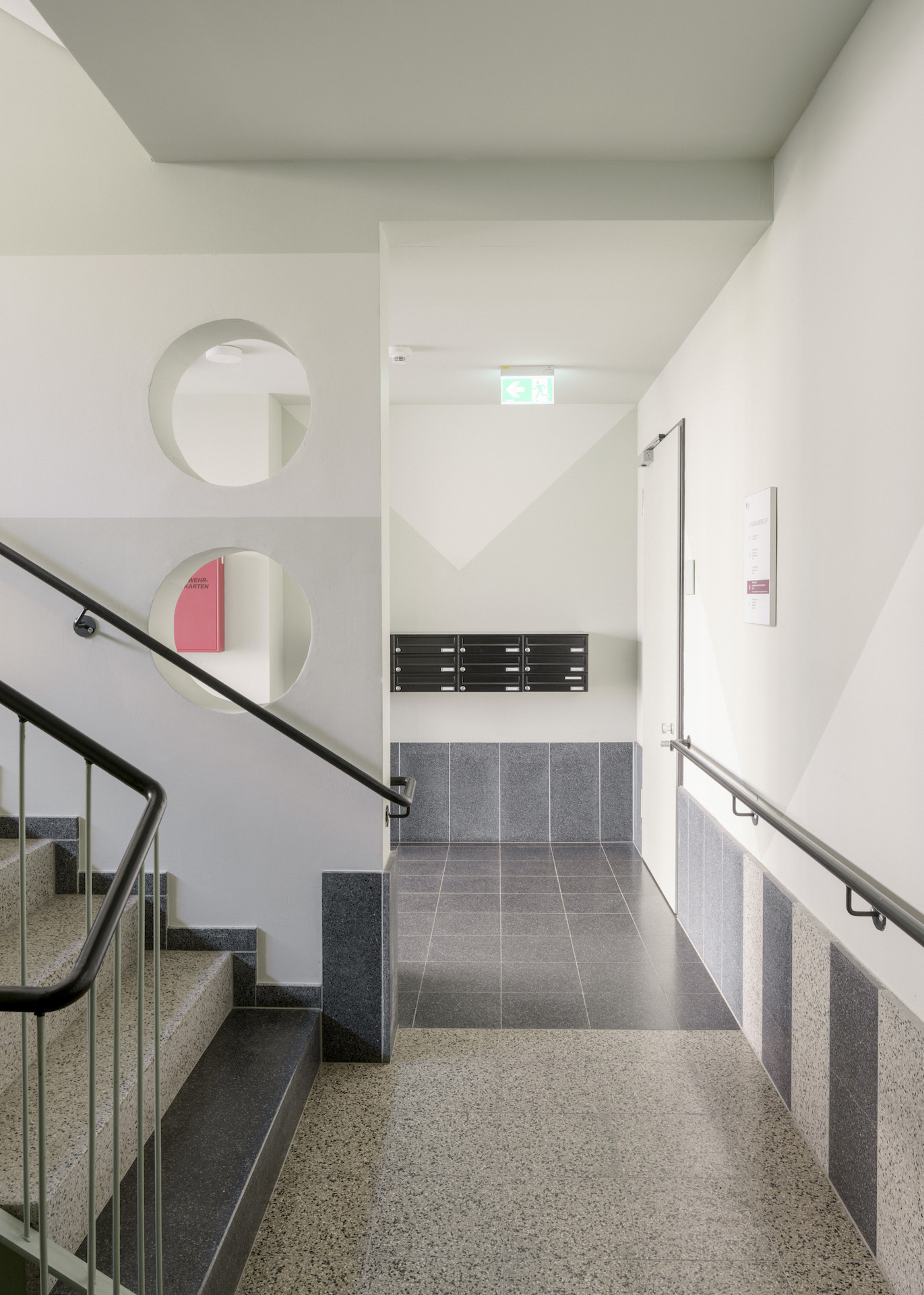 Two stairwells guarantee optimum safety in an emergency. The entire house is barrier-free and wheelchair accessible. The greatest attention was also paid to all the necessary requirements in terms of design: Wheelchair waiting areas in the stairwells, clear heights in the windows, high-contrast light switches and handles, handrails in the public areas, maximised glass cut-outs, push-buttons and emergency call systems throughout the building.