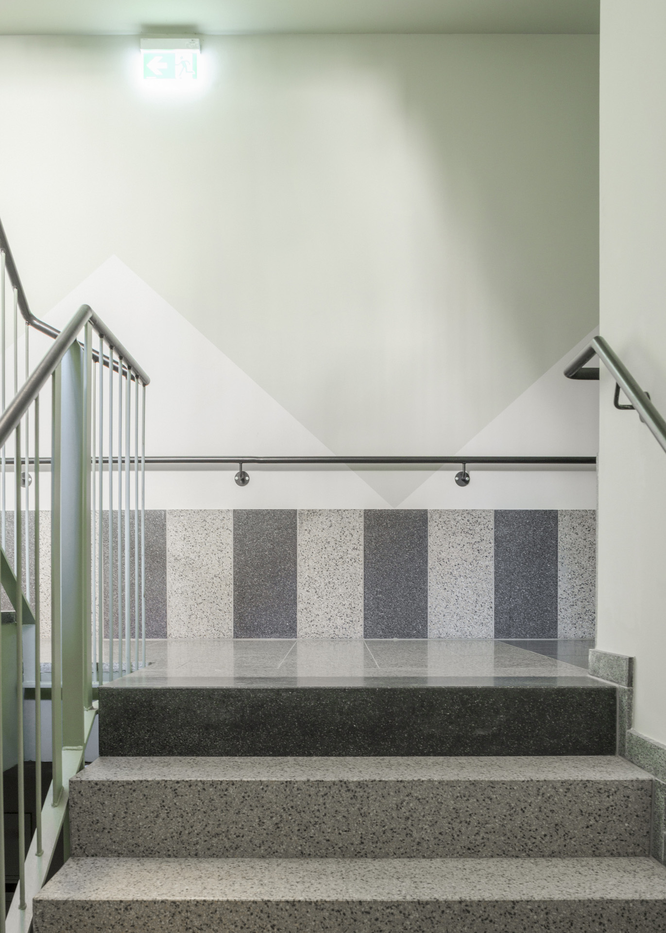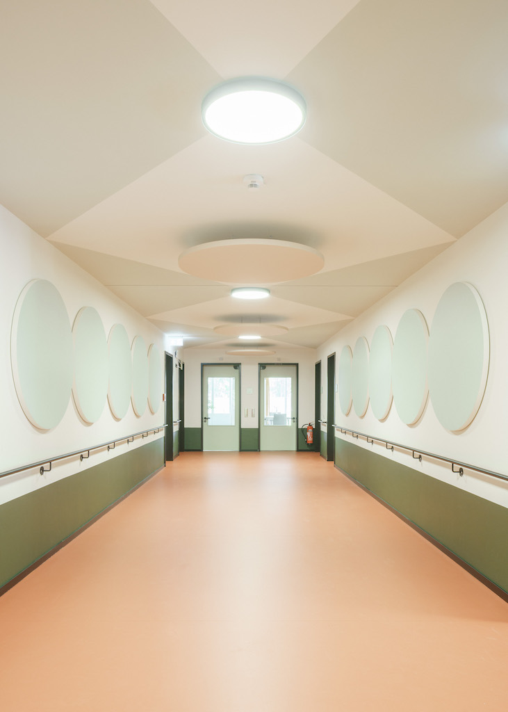 The address for the house is to the south, Nordendstraße, where there are also two gates in the open old wall. If you walk up the wheelchair-accessible paths, you approach the green, roughcast plinth, protected by the roof. Cut into a protrusion, the exterior dress becomes haptic here: shiny green tiles emphasise the entrance. Not only the entrance areas, but the entire ground floor is stone, solid, a solid base. Terrazzo tiles on the floor and a green and white pattern on the walls welcome users inside. And then you enter the central hallway: an open distribution room, the centre, the heart of the house, generous space instead of a narrow corridor. On the top floor, the hallway receives additional light, made possible by a special construction of intersecting rafters, where the sky becomes visible.