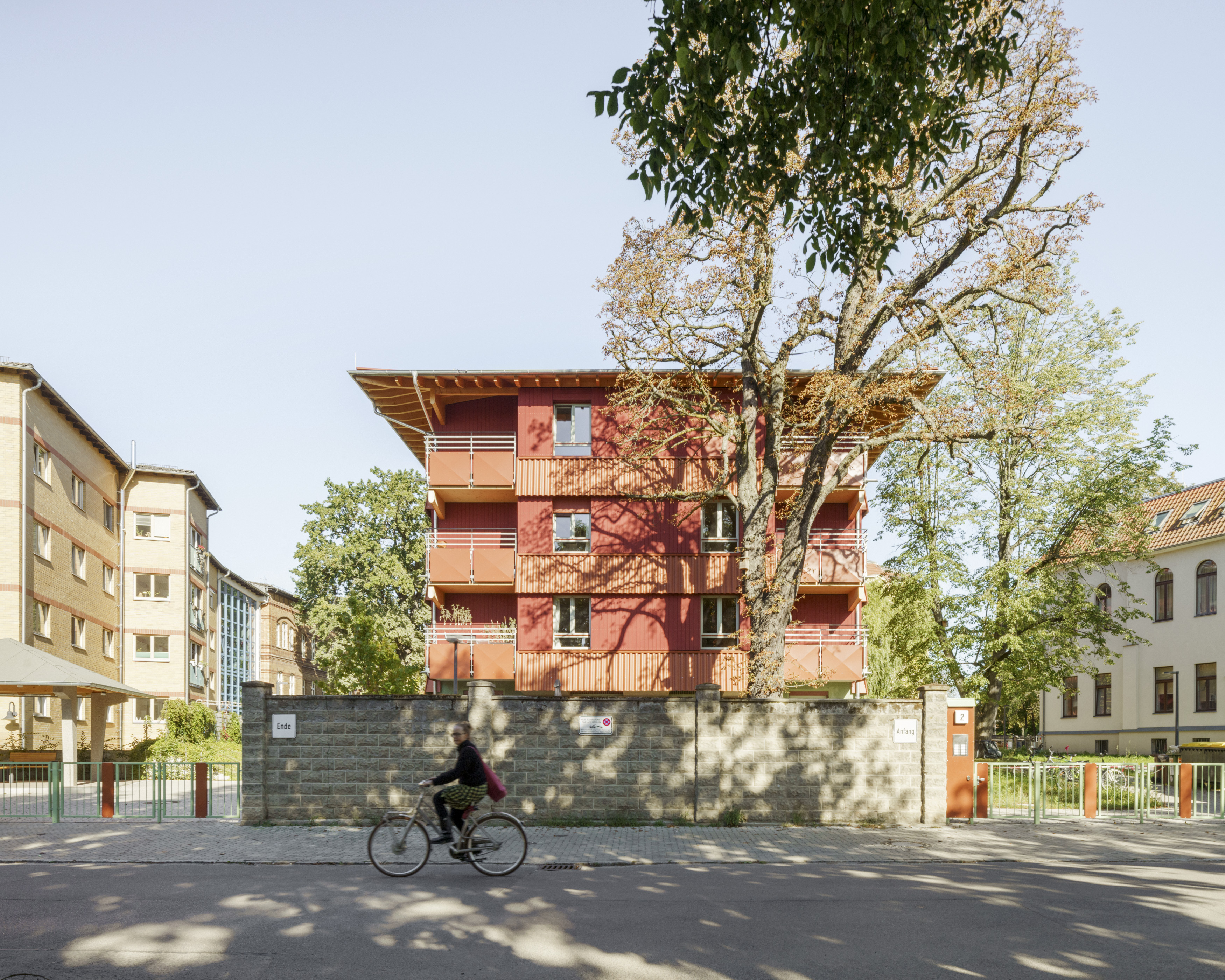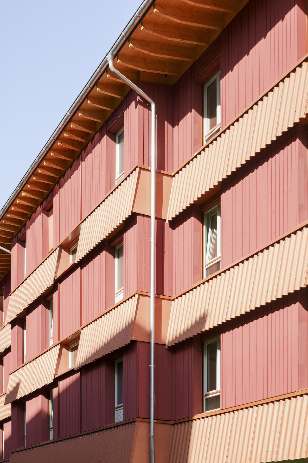 Like the roof, the upper storeys are also built from wood, load-bearing walls and ceilings from solid CLT, large elements, thickly packed in mineral insulation, weather-protected, clad in red glazed boards, rough sawn. The elements arrived in Berlin from Lower Saxony prefabricated, including windows and panelling. Only the protective skirts were installed on site; they cover the joints, absorb the sun protection and will delay the ageing of the wood. The skirts are made of corrugated cement and their sheet metal end acts as a fire protection bar.