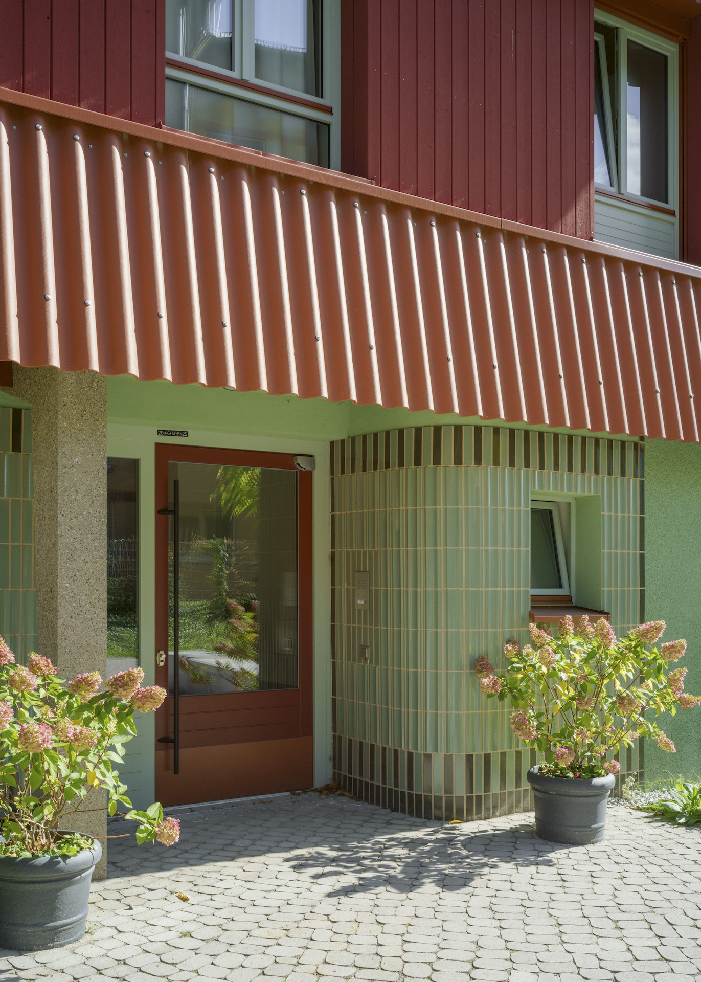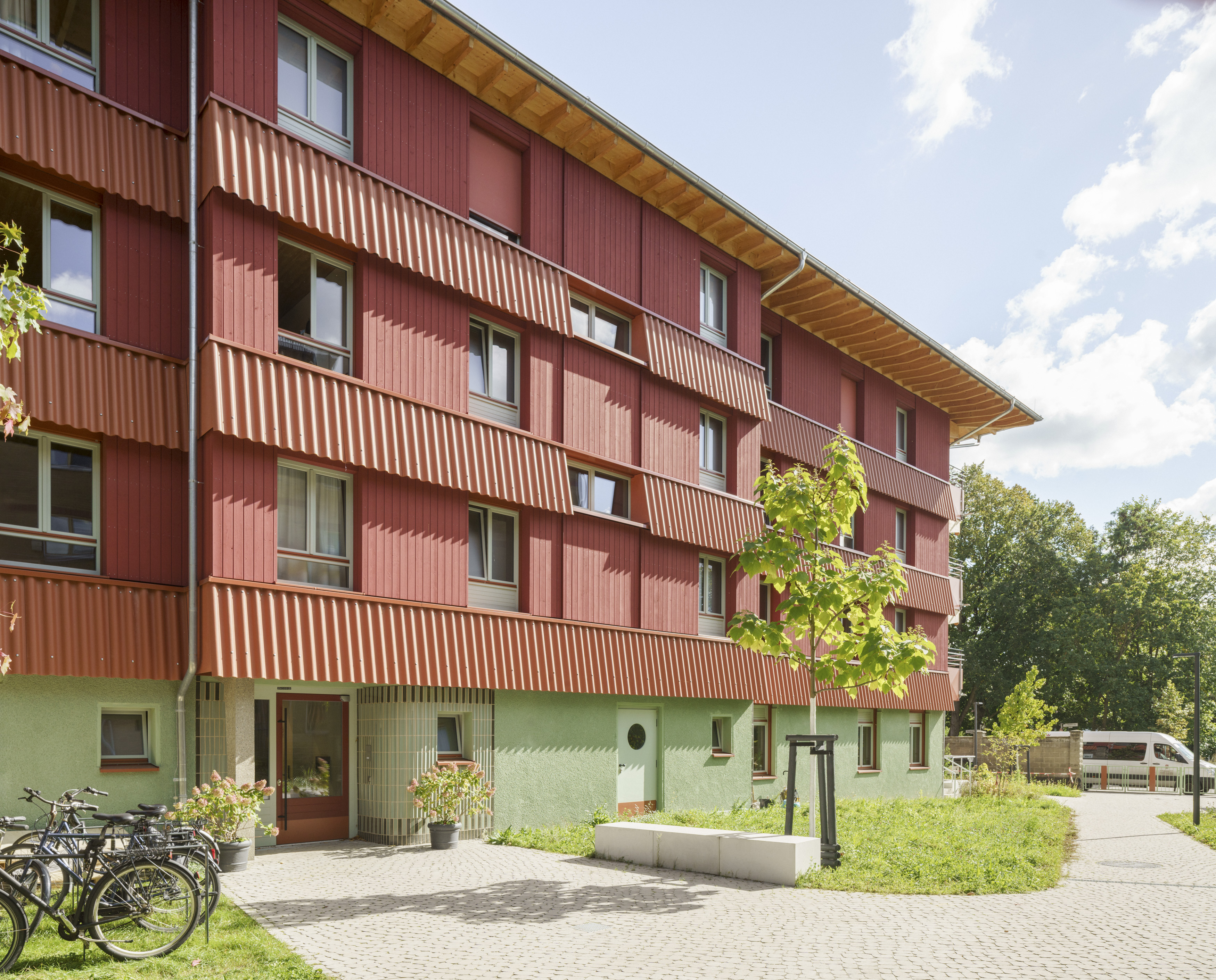 The two separate entrances serve the purpose of equalisation and are important for orientation; the two areas are operated and financed by different facilities, the area on the ground floor is only to be used during the day.
