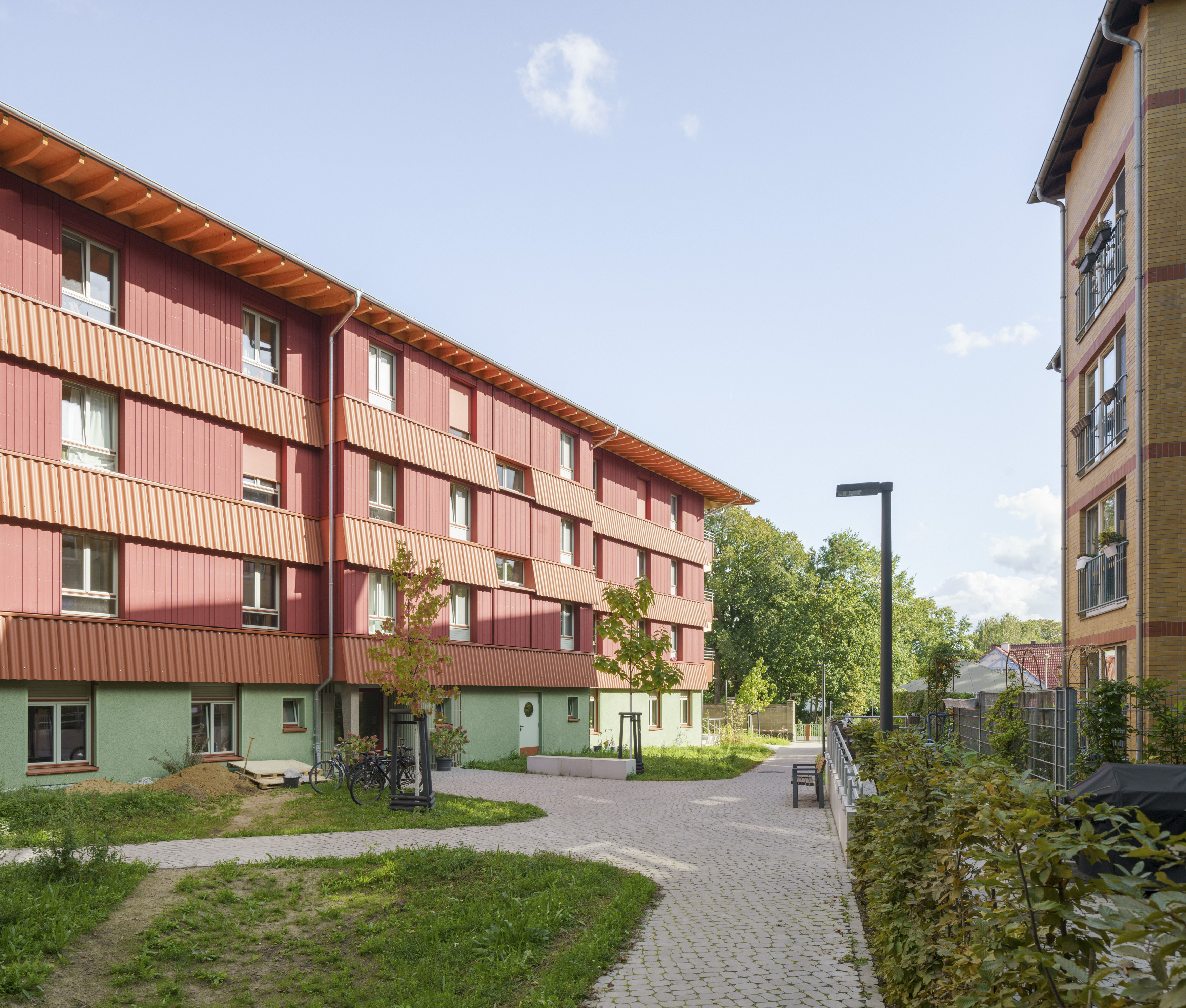 On a park-like plot in Pankow, a northern district in Berlin, between listed turn-of-the-century villas, a sober and functional extension from the 1990s and large old trees that have accompanied the history of this historic site, there is an ideal location for another new dormitory run by SKF Berlin e.V. (transl.: Non-Profit Social Service of Catholic Women).