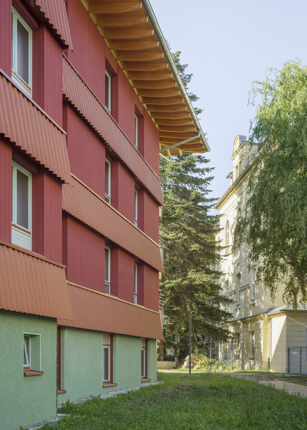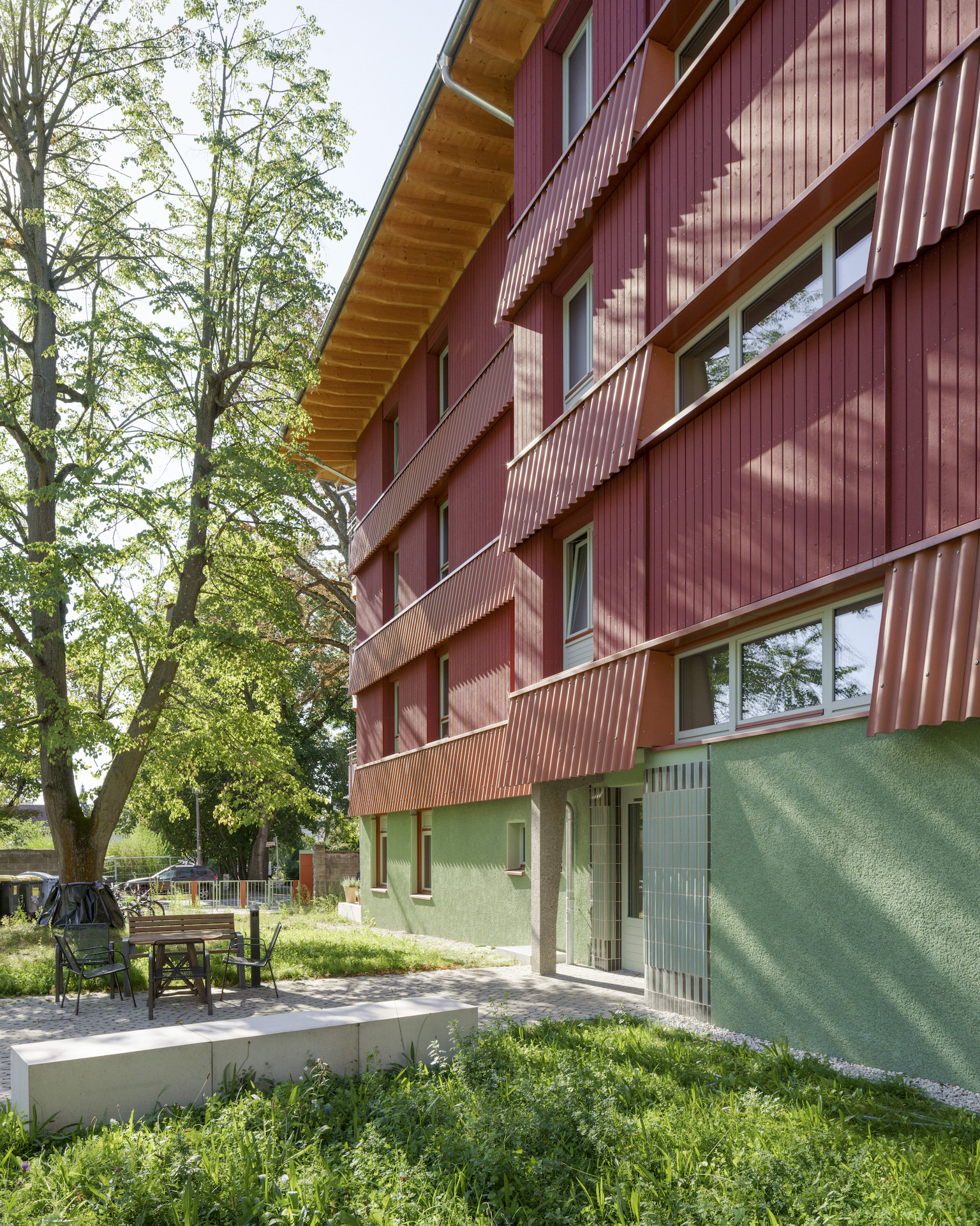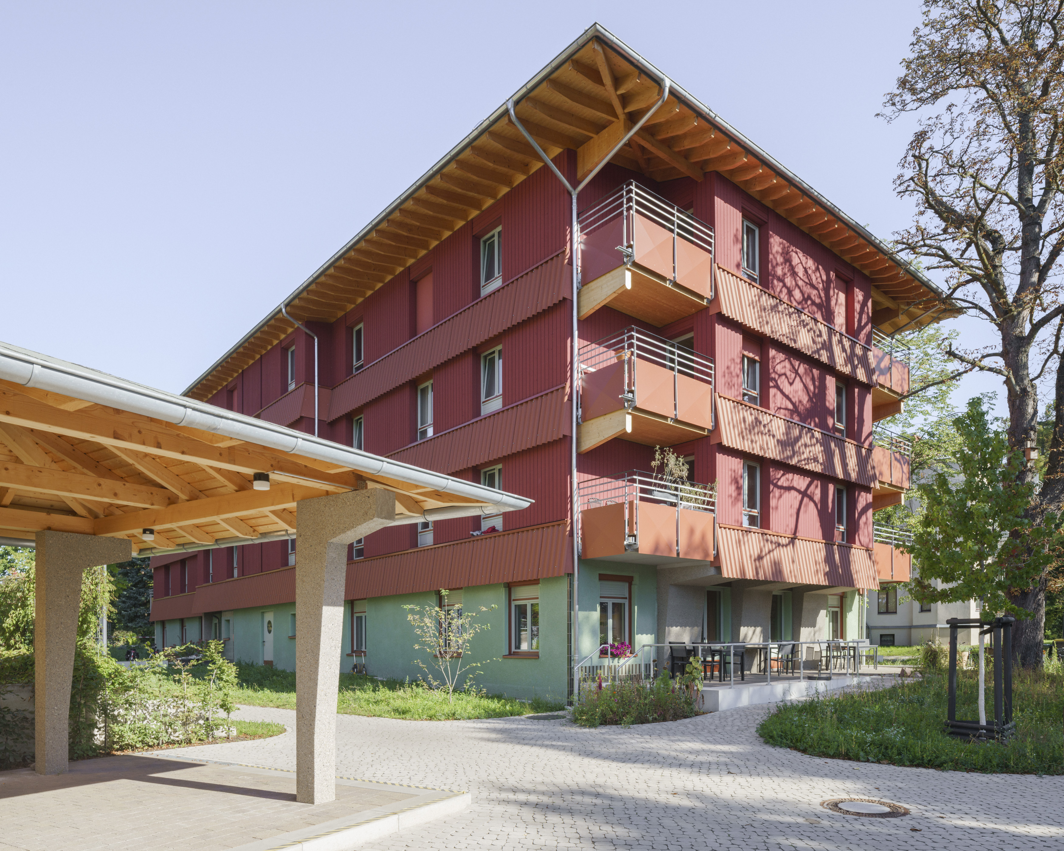 Four storeys, crowned by a cantilevered roof whose wooden rafters remain visible on the outside, a solid green plastered base and a wooden superstructure will be the new home for up to 32 residents with mental and physical disabilities.